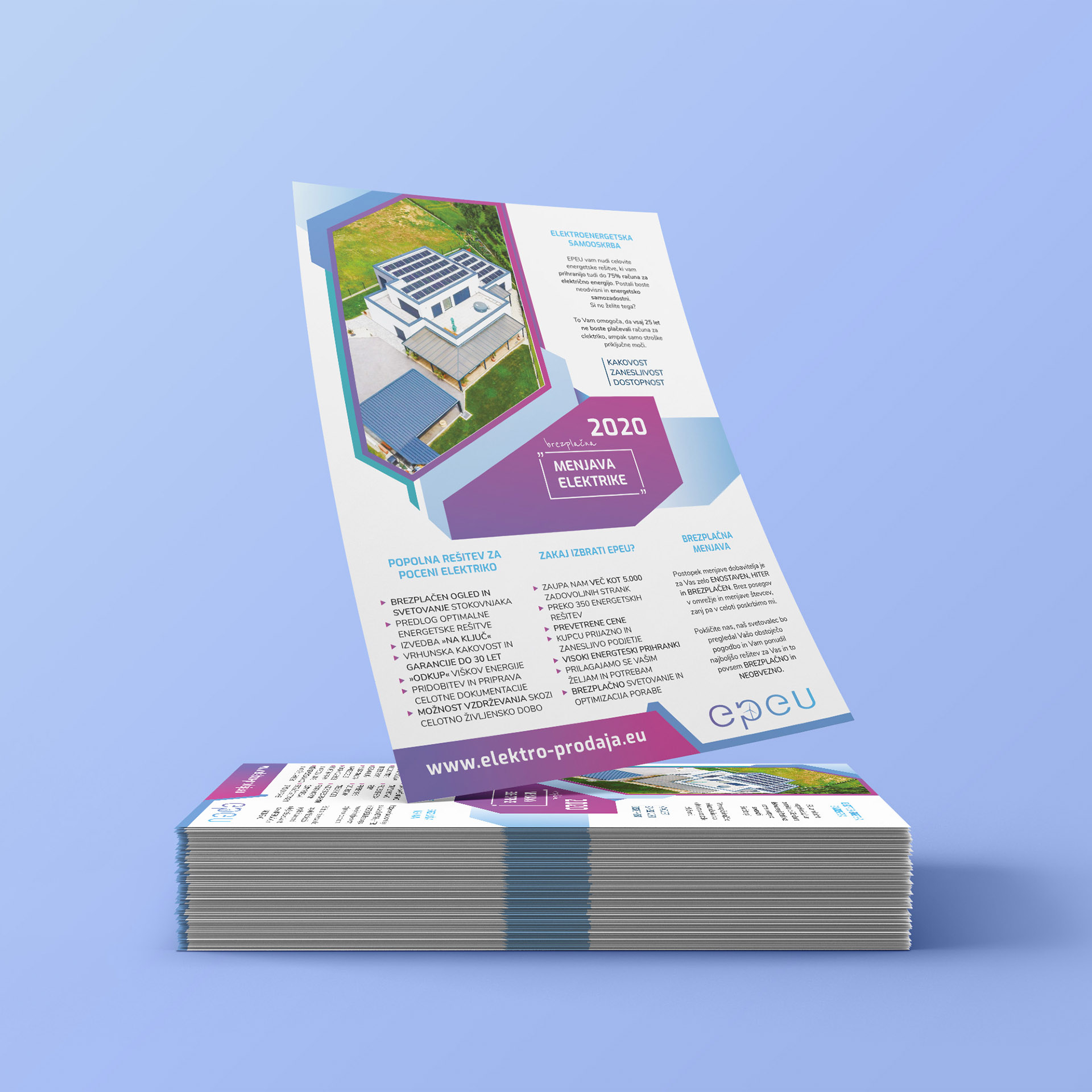Logotip smo "prenovili". Eleganca, minimalizem in prelivanje barv. Celotno podjetje se z novo podobo idealno poveže, njihove nove pisarne sedaj sijejo v luči nove podobe in jim zelo pristoji. Naša naloga je bila celostna grafična podoba podjetja, izdelava vizitk, reklamnih materialov, kot so letaki, roll upi, zastave in svetlobne table.